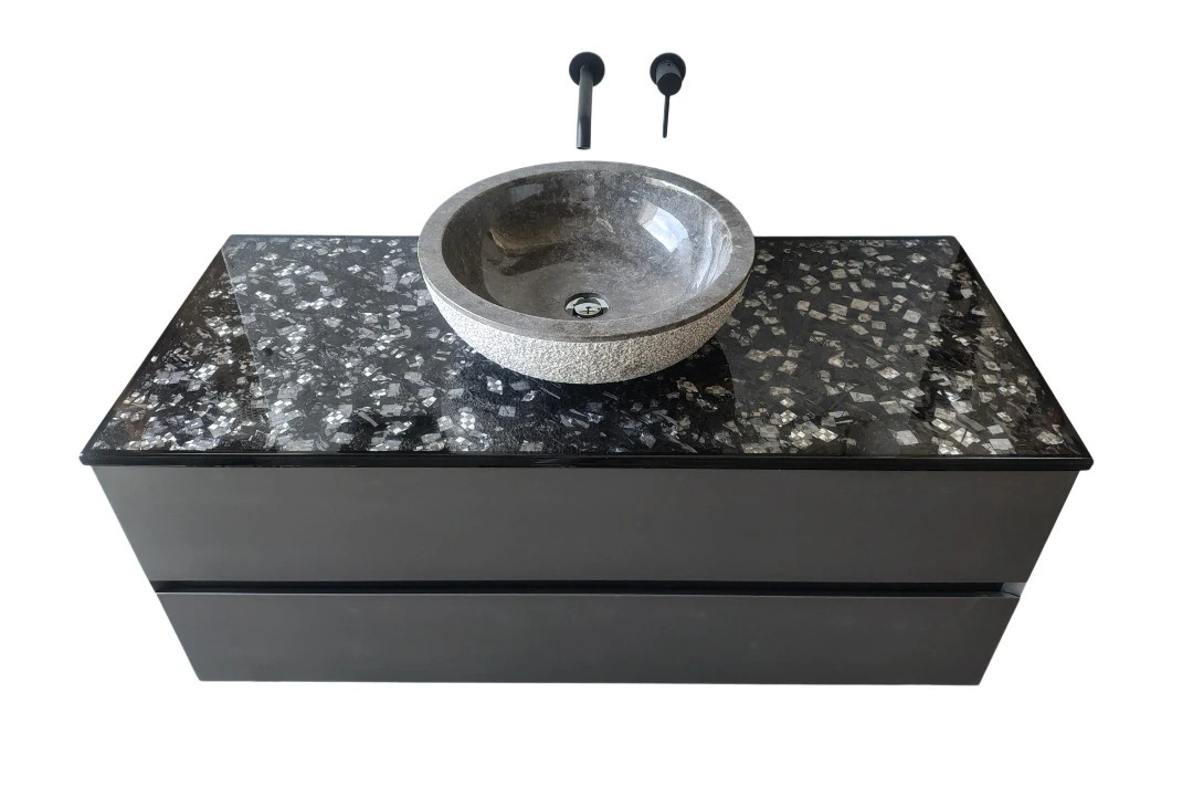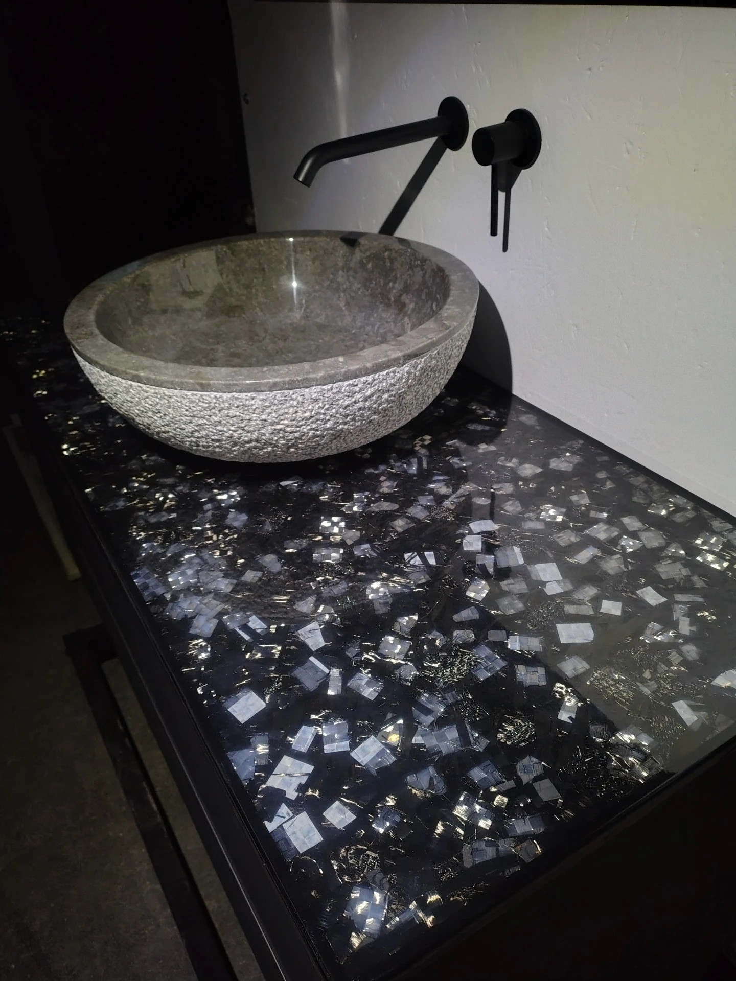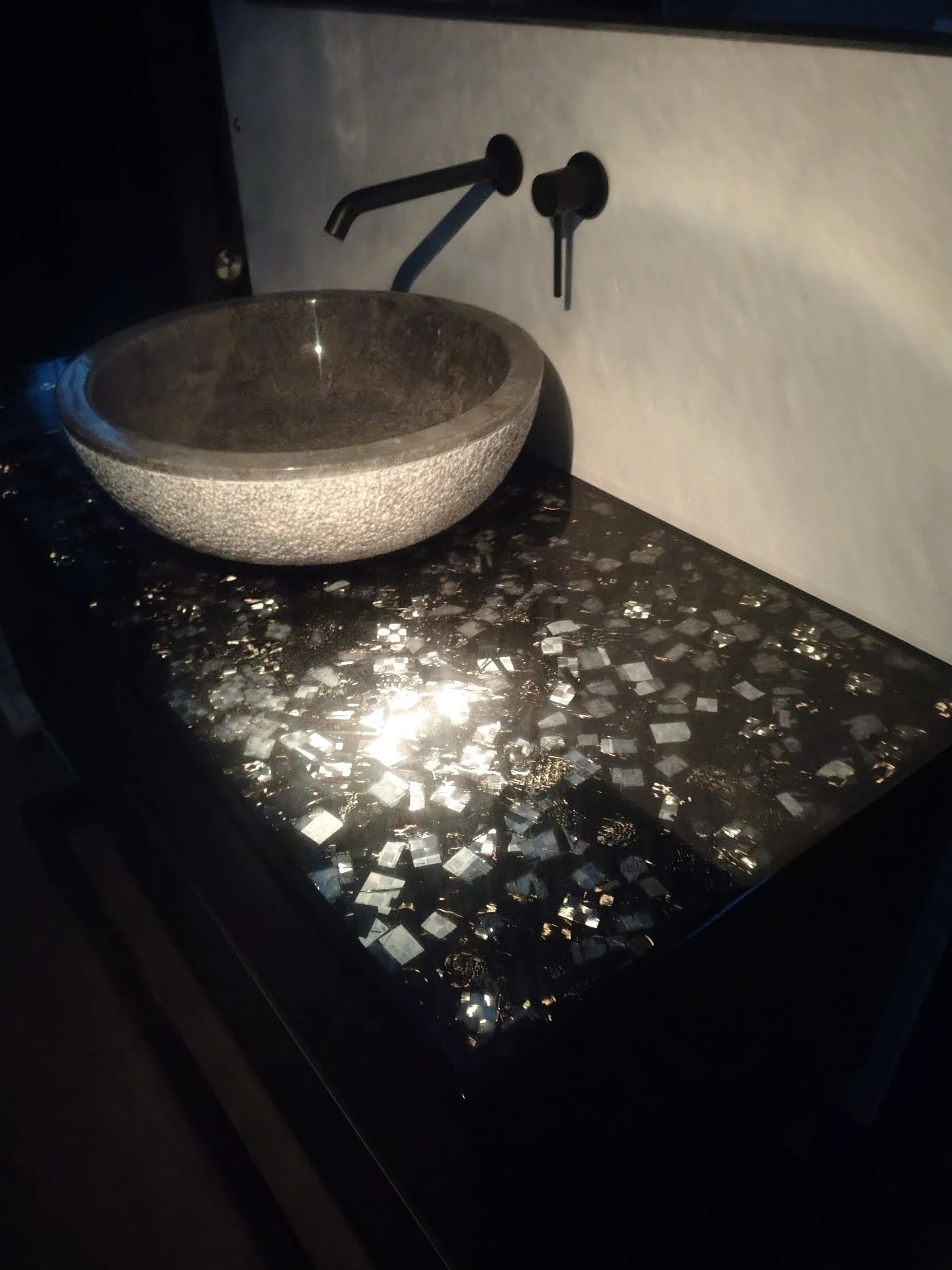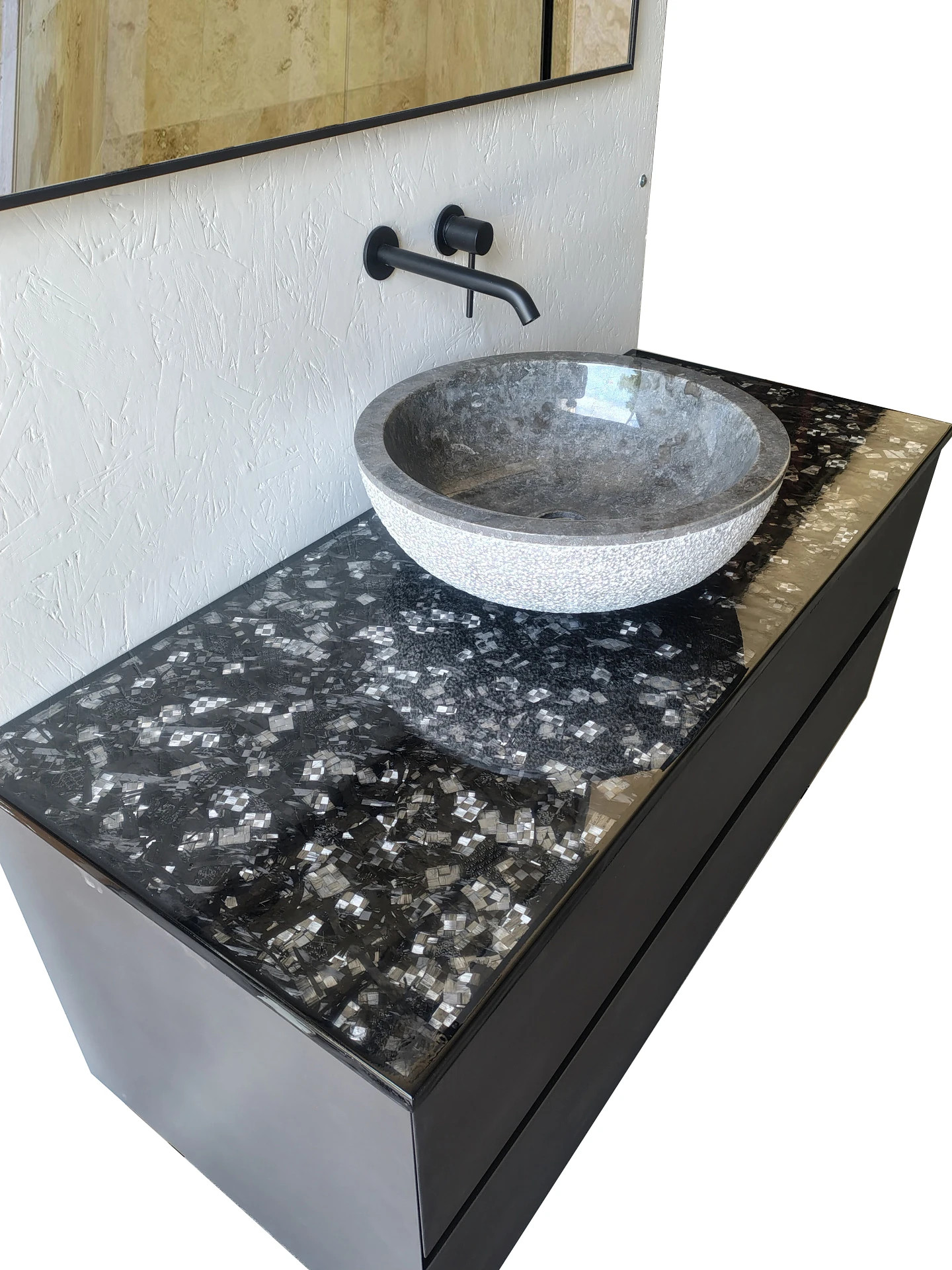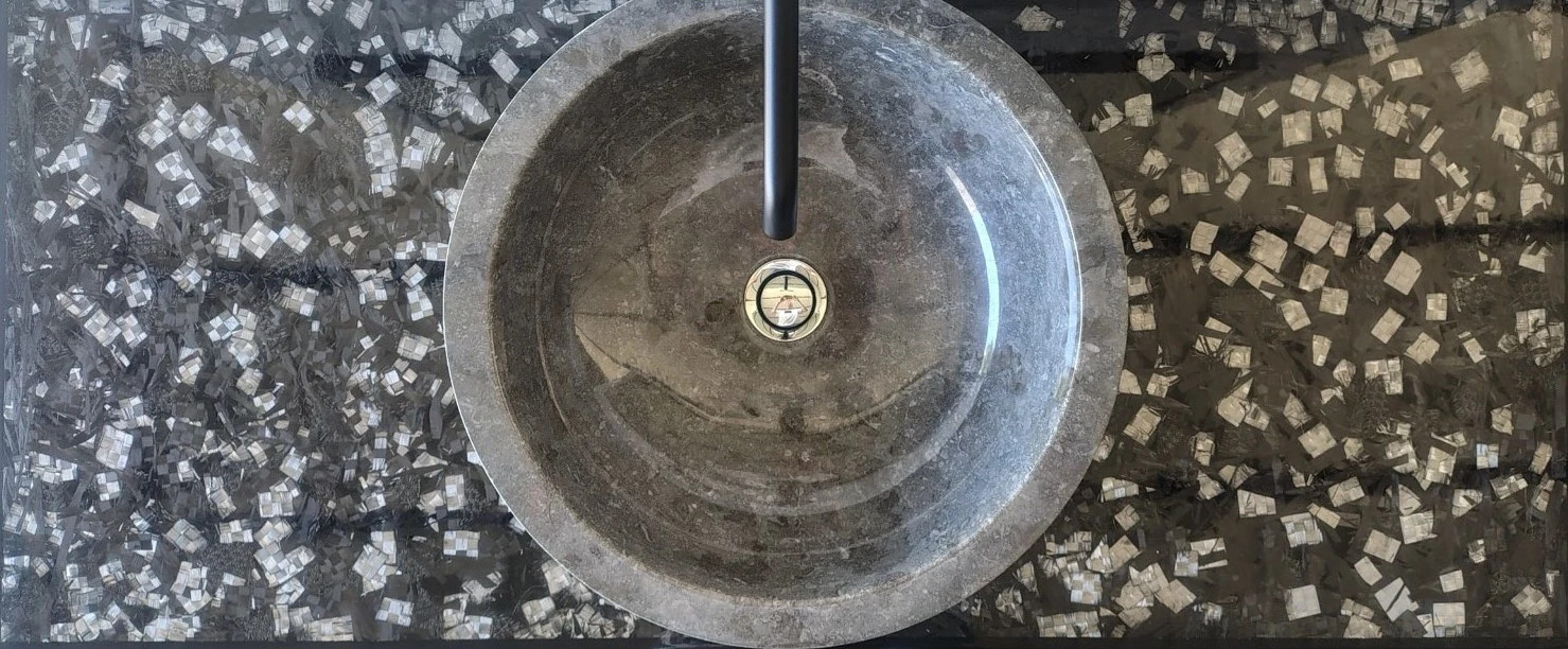 resina cristallina antigraffio coordinato da un lavello di pietra con