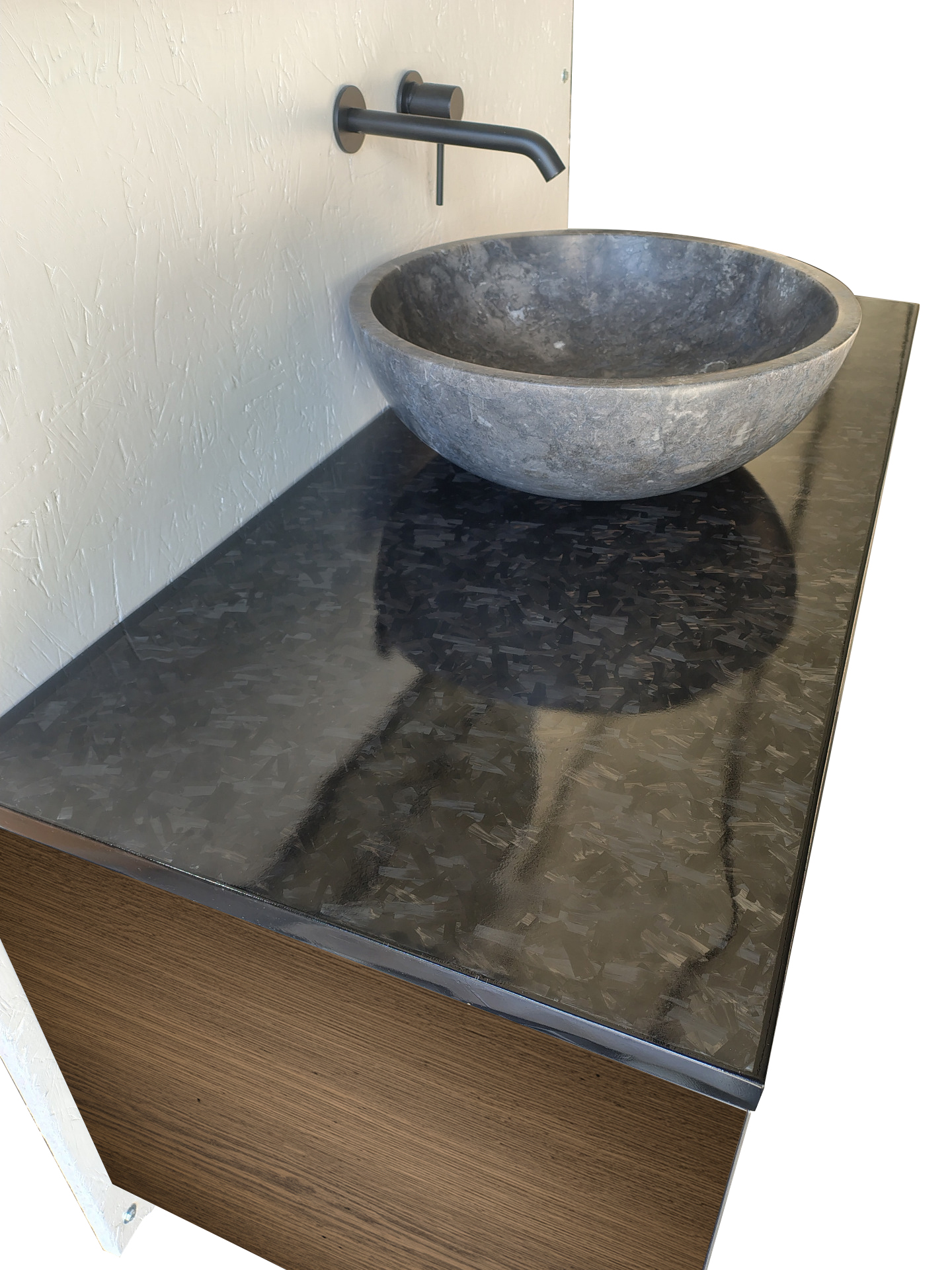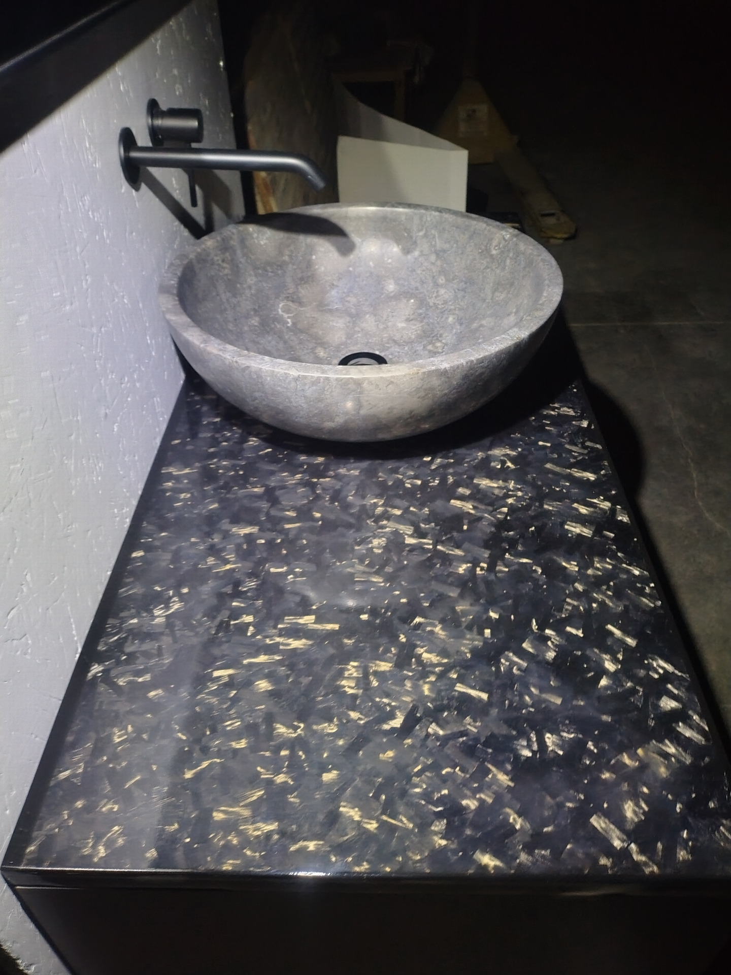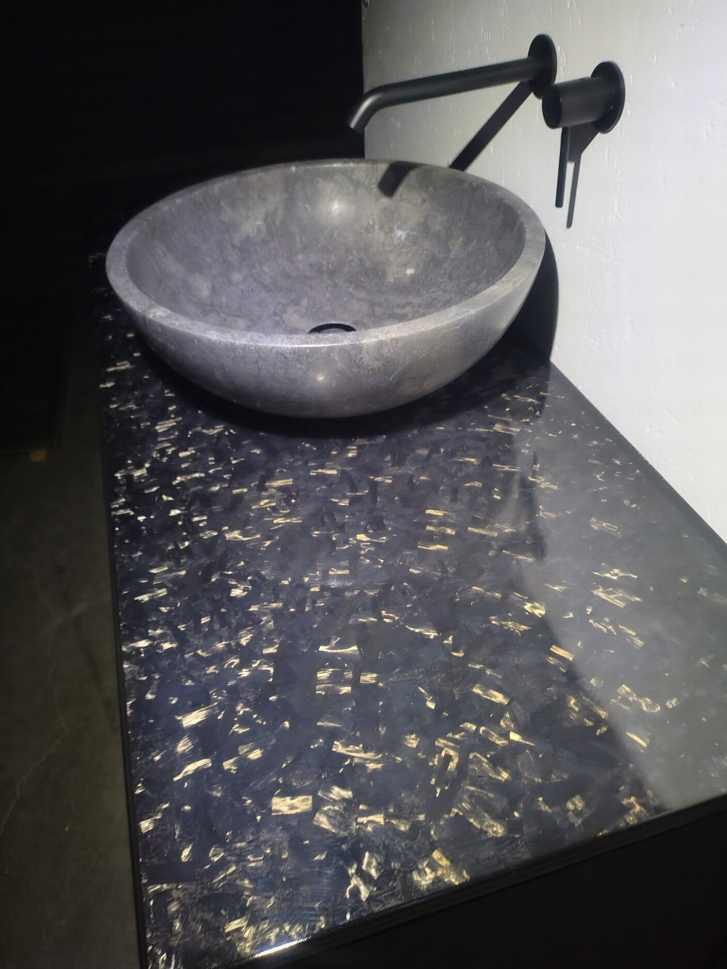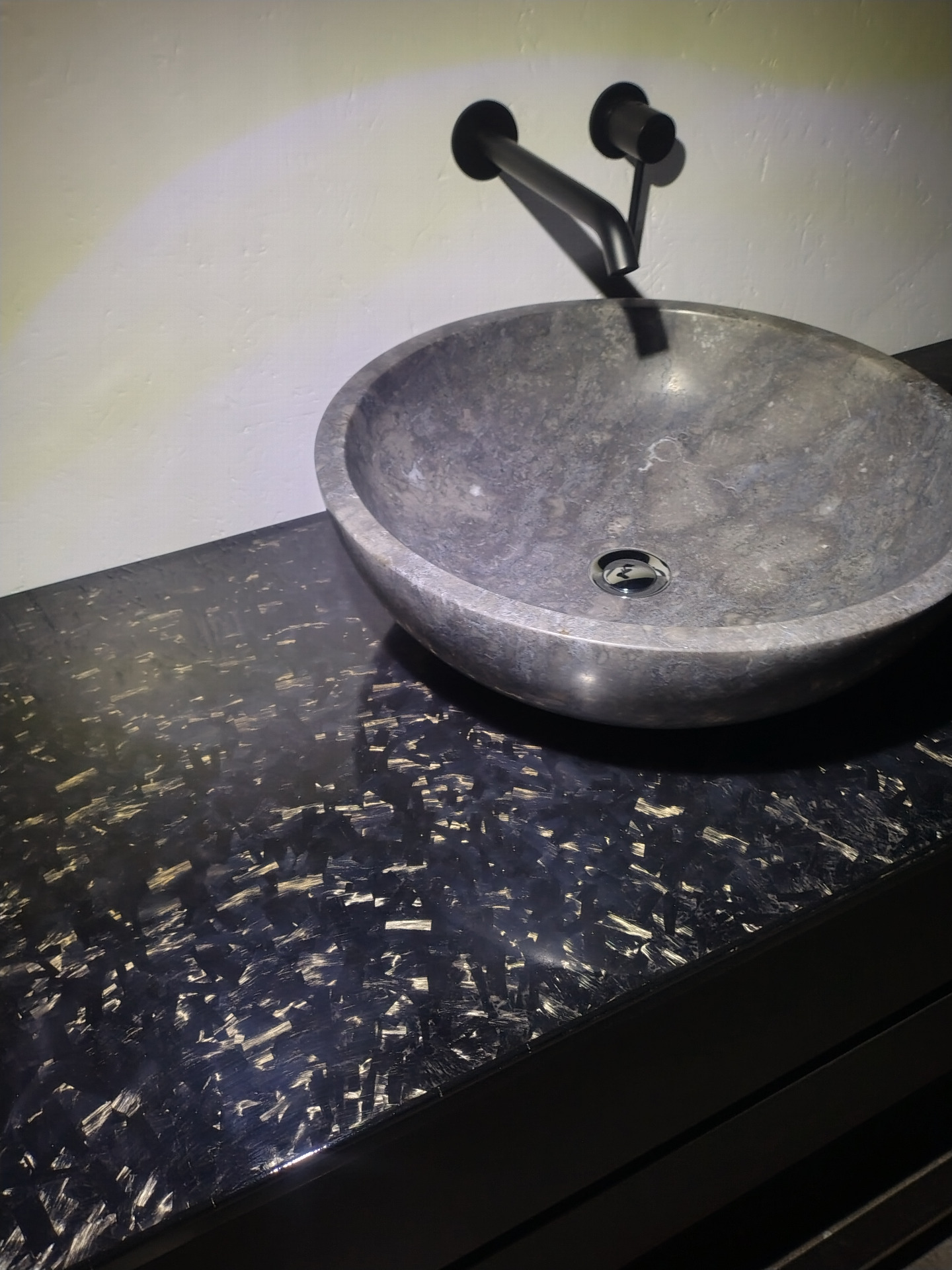 resina cristallina antigraffio coordinato da un lavello di pietra del diametro di 40 cm con finitura