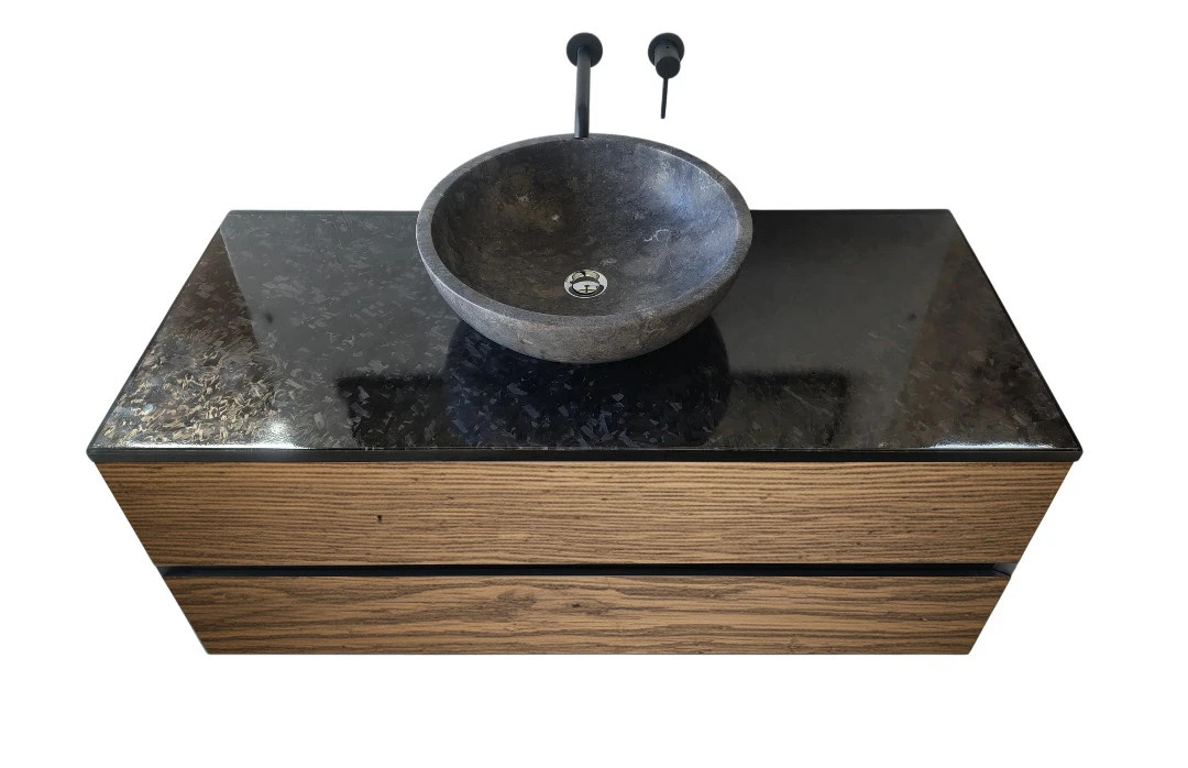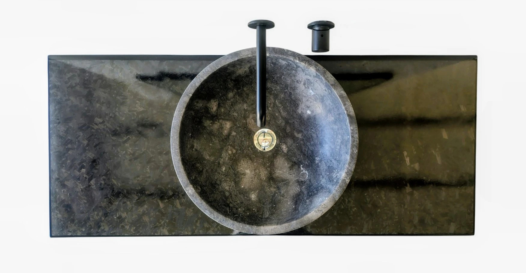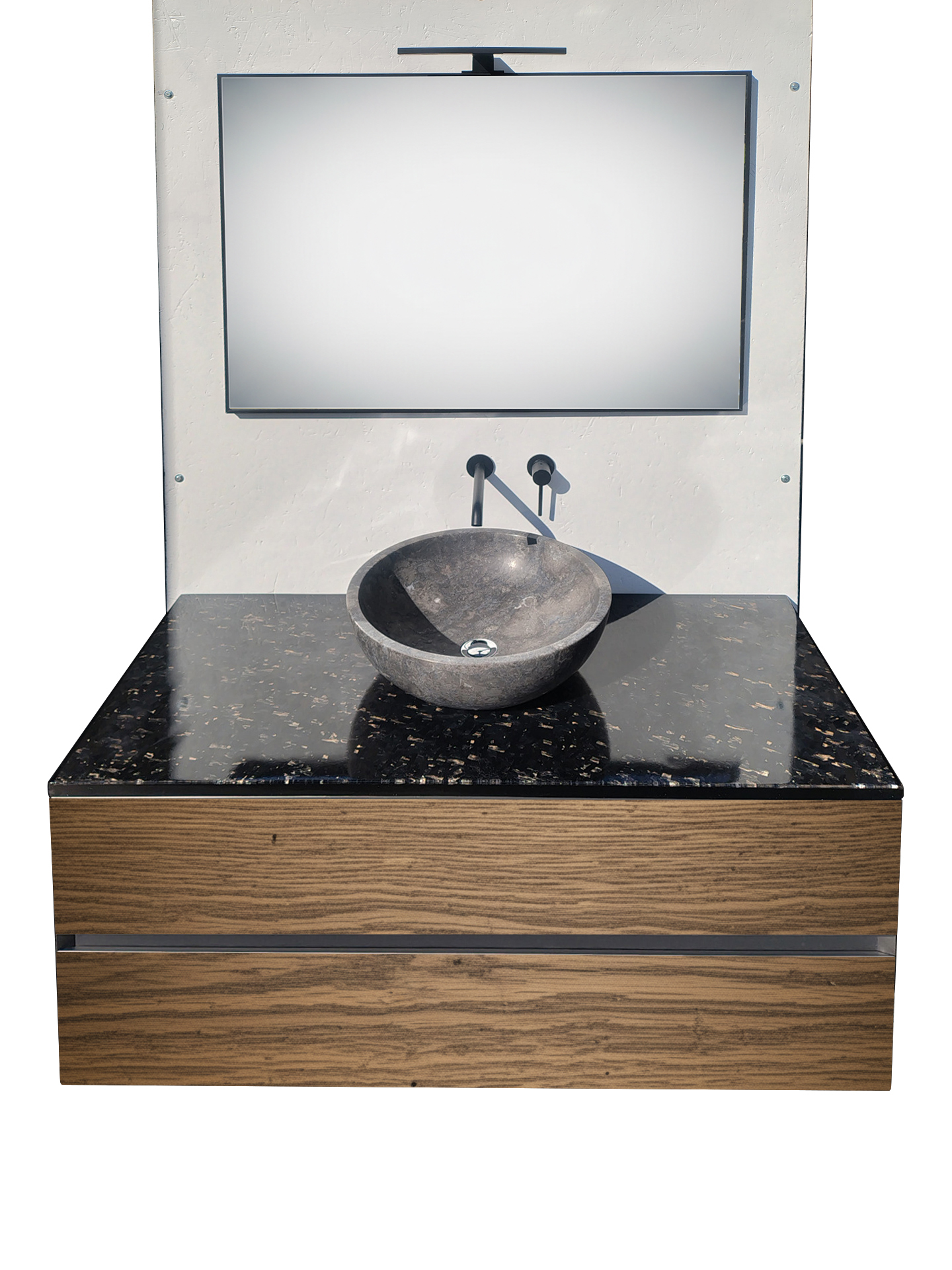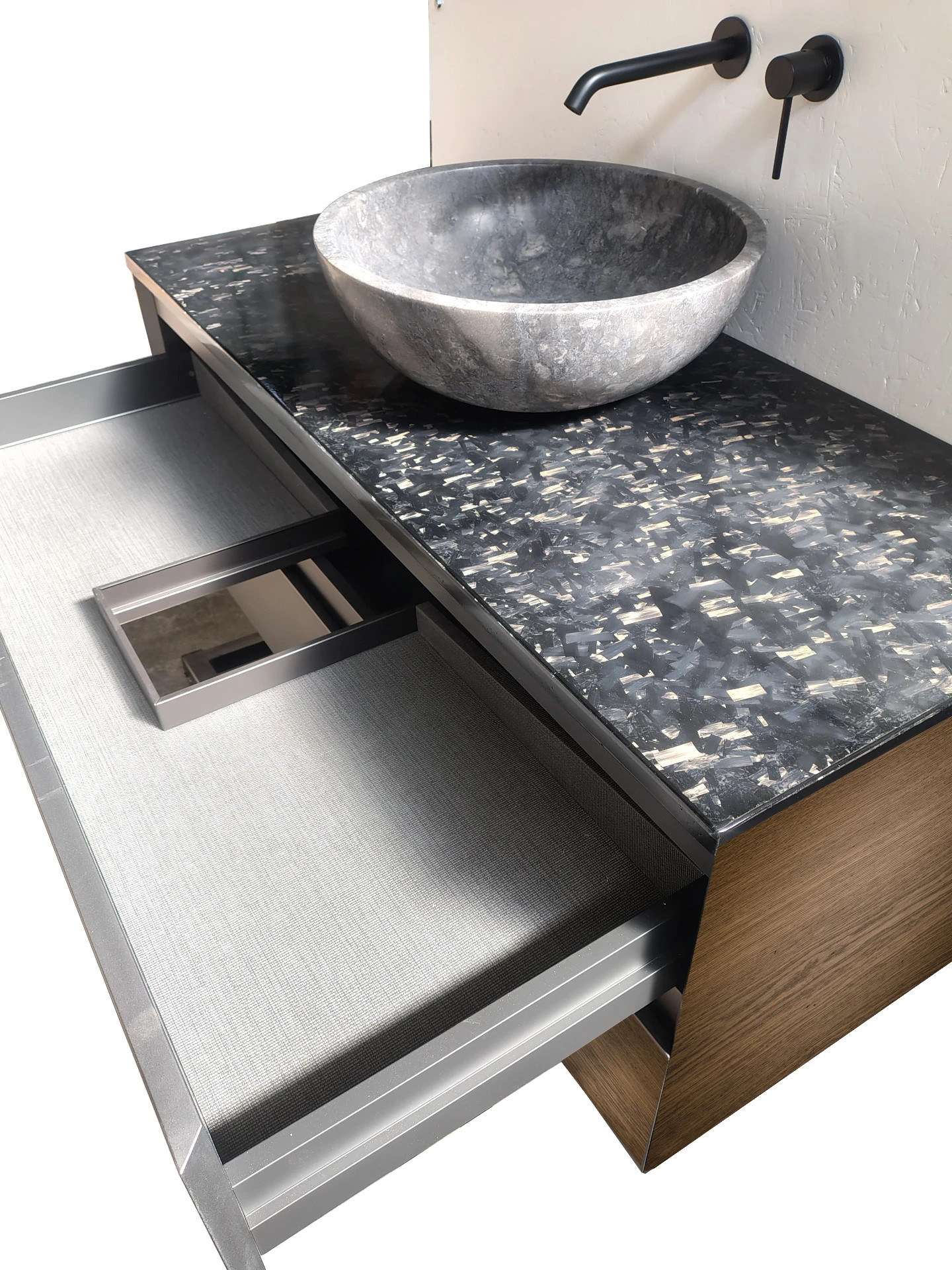 resina cristallina antigraffio coordinato da un lavello di pietra del diametro di 40 cm con finitura